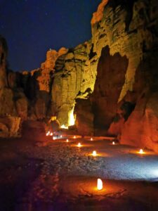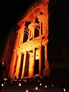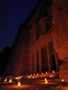 Cała trasa wyłożona jest migoczącymi lampionami, które oświetlają nam drogę. Wszystkie poustawiane po obu stronach ścieżki w niewielkich odstępach w ilości ponad 1500 sztuk. Jest pięknie. Wąwóz Siq ukazuje teraz swoje nocne oblicze i oczarowuje pustką, ciszą, spokojem i delikatnym światłem z lampionów, które pada na pokryte mrokiem skały. Byłam- widziałam. Warto.