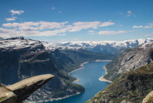 To całodzienny trekking prowadzący na skalną półkę zawieszoną setki metrów nad jeziorem Ringedalsvatnet. Widok z Trolltungi to jedna z najbardziej rozpoznawalnych panoram Norwegii. Jeśli uda nam się zarezerwować parking na samej górze to czeka nas 20km trekkingu, w innym przypadku ok 27km.