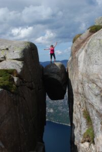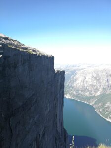 - widoki na pionowe ściany fiordu i słynną Kjeragbolten – zaklinowany między skałami głaz