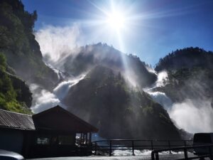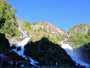 Po drodze przejedziemy wzdłuż wodospadu Låtefossen. Dwa potężne strumienie spadające pod zabytkowym kamiennym mostem, to jeden z najczęściej fotografowanych wodospadów w kraju.