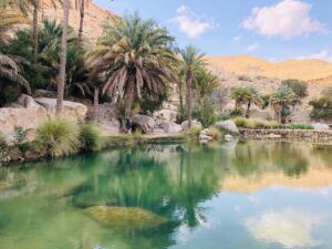 Po drodze wioska Birkat al Mouz, która przeniesie Cię do dawnego, zapomnianego świata tradycyjnego budownictwa i rolnictwa w Omanie. Piękne plantacje palm daktylowych i bananowych, wspaniałe widoki i fantastycznie zachowany, wciąż dzisiaj wykorzystywany system nawadniania falaj, który wpisany jest na Listę Światowego Dziedzictwa UNESCO.